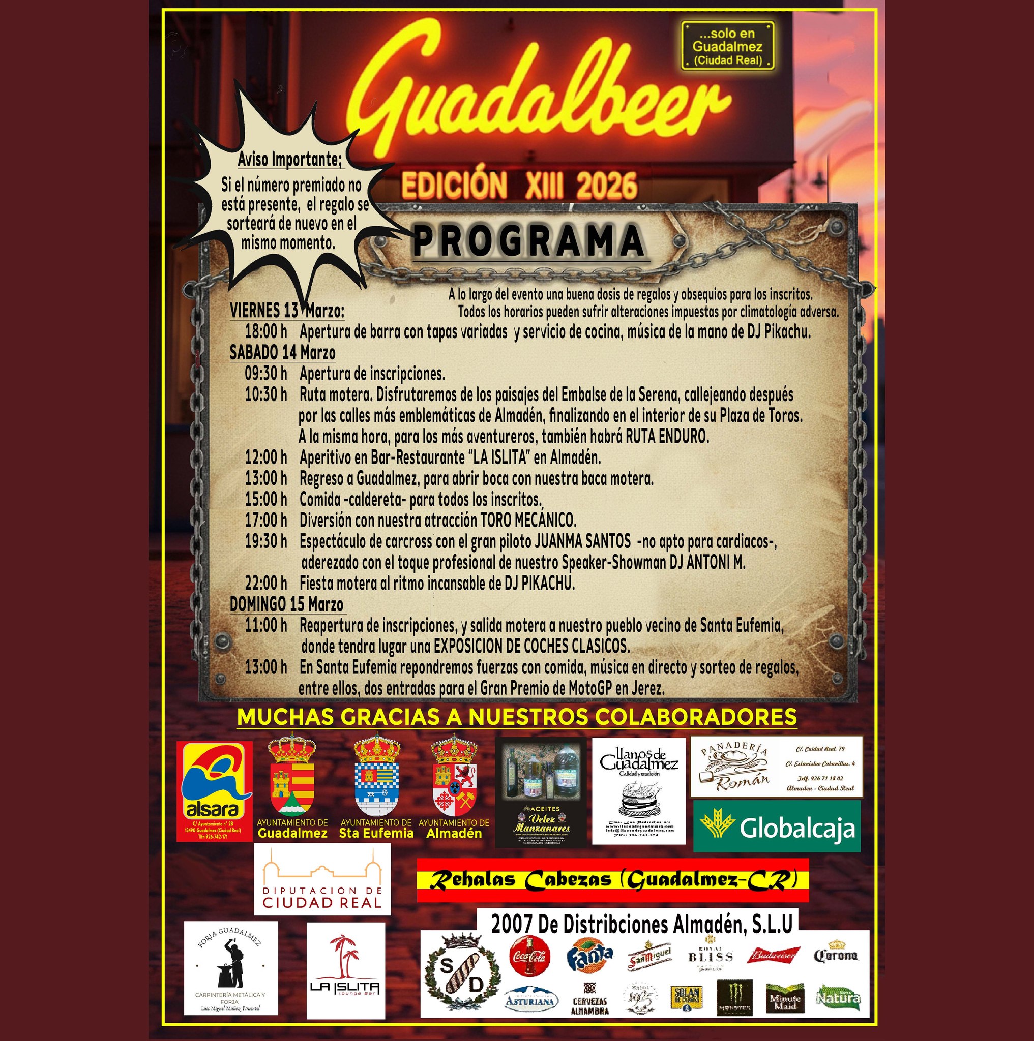 13:00 h En Santa Eufemia repondremos fuerzas con comida, música en directo y sorteo de regalos, entre ellos, dos entradas para el Gran Premio de MotoGP en Jerez