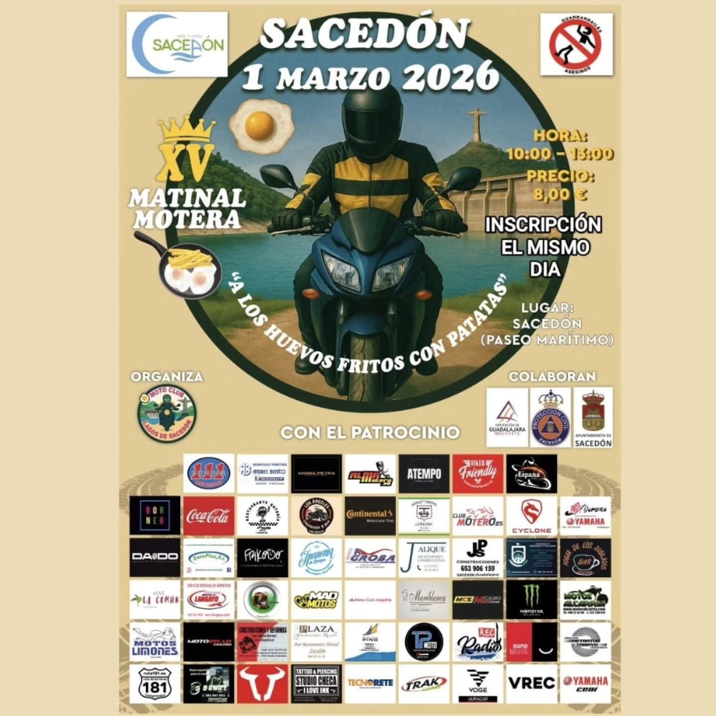Finalmente y ante la previsión de buena meteorología, los organizadores han fijado el primer domingo de marzo para que las motos llenen Sacedón, disfruten los moteros de un buen desayuno a base de huevos, chorizo, patatas y puedan disfrutar del paisaje del Mar de Castilla, con un embalse de Entrepeñas rozando el 80% de su capacidad.